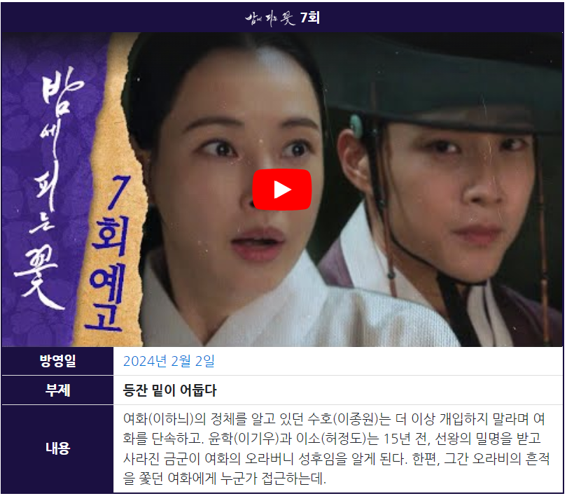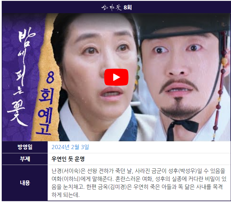 '밤에 피는 꽃' 9회는 오는 9일 9시50분에 방송될 예정이다.(방송사에 따라 시간변동은 있을 수 있습니다)
